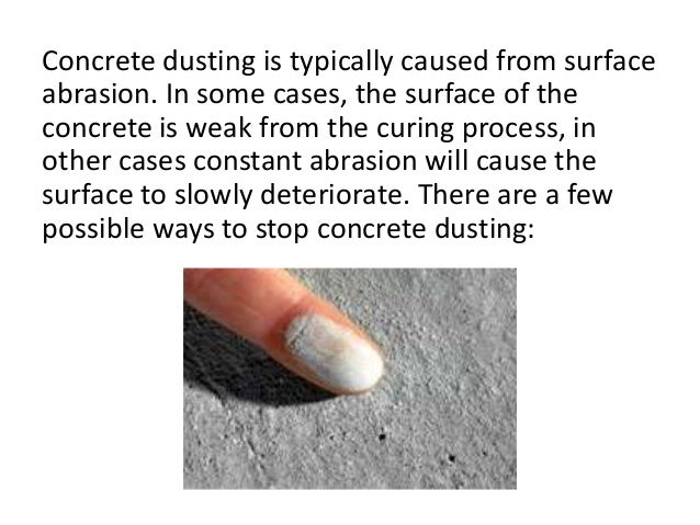 Dusting is the development of a soft powdery material that can be easily rubbed off the surface of hardened concrete.