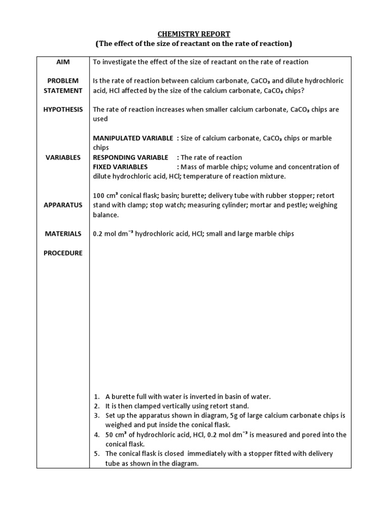 Hydrochloric acid to react with the marble chips independent variable marble chips to react with the acid dependent variable stopwatch to accurately time the experiment spatula to handle the marble chips measuring cylinder to precisely measure out different concentrations of hydryochloric acid electric balance to measure the mass g of the marble chips bung.